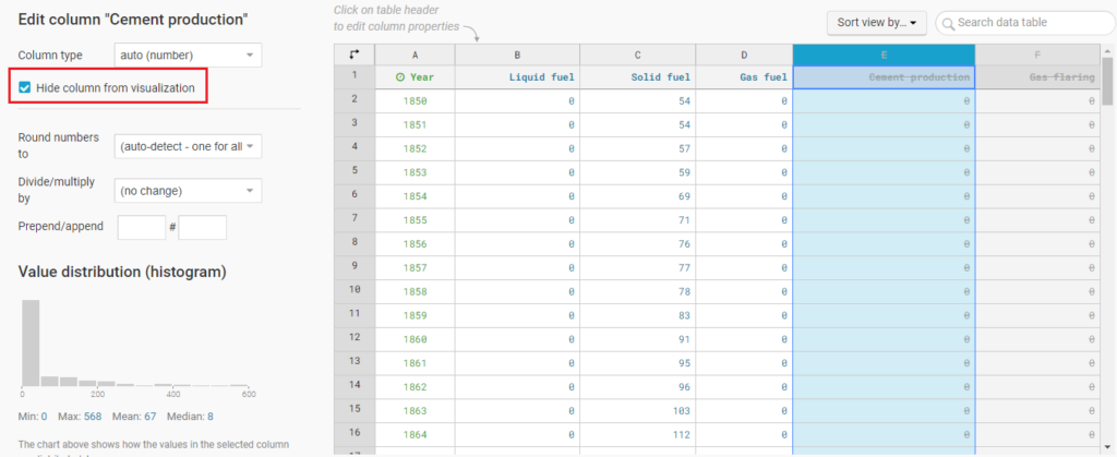 Vous pouvez exclure des colonnes ou des lignes de votre visualisation en cliquant sur leur en-tête, puis en cochant « Hide column from visualization ».