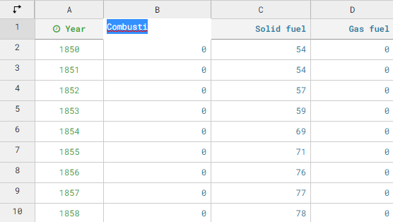 Pour ce scénario, nous avons masqué les colonnes « Cement production » et « Gas flaring », puisqu’elles ne décrivent pas des types de combustible. Nous avons aussi renommé les colonnes restantes pour leur attribuer un nom en français.