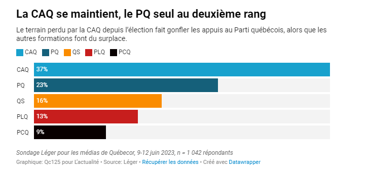 Philippe J. Fournier, agrégateur de sondages sur les intentions de vote en Amérique du Nord, utilise Datawrapper pour imbriquer des éléments de cadre intégré HTML dans ses articles publiés sur le site Web de L’actualité. Allez regarder l’élément sur le site du magazine pour voir comment il est possible d’interagir avec lui.