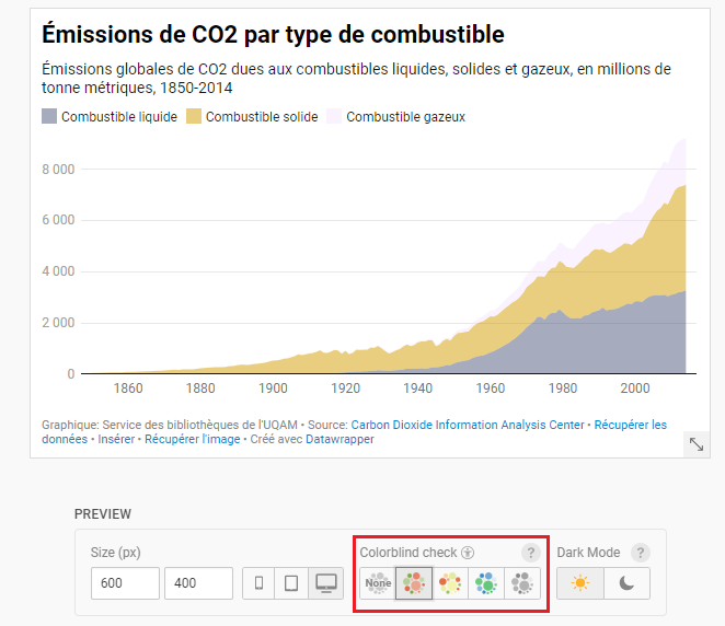 Pour ce scénario, nous voulions représenter nos données avec un graphique en aires. Par conséquent, nous avons sélectionné le type de figure « Area Chart ». Dans le sous-menu des annotations, nous avons ajouté un titre et une description à notre figure, puis en avons précisé l’auteur. Puis, nous avons défini la langue de la figure sur « français (fr-CA) » et autorisé les internautes à télécharger nos données et une image de la figure. Nous les avons enfin autorisés à copiez-collez la figure en tant élément de cadre intégré HTML.Modifier les couleurs d’une figure